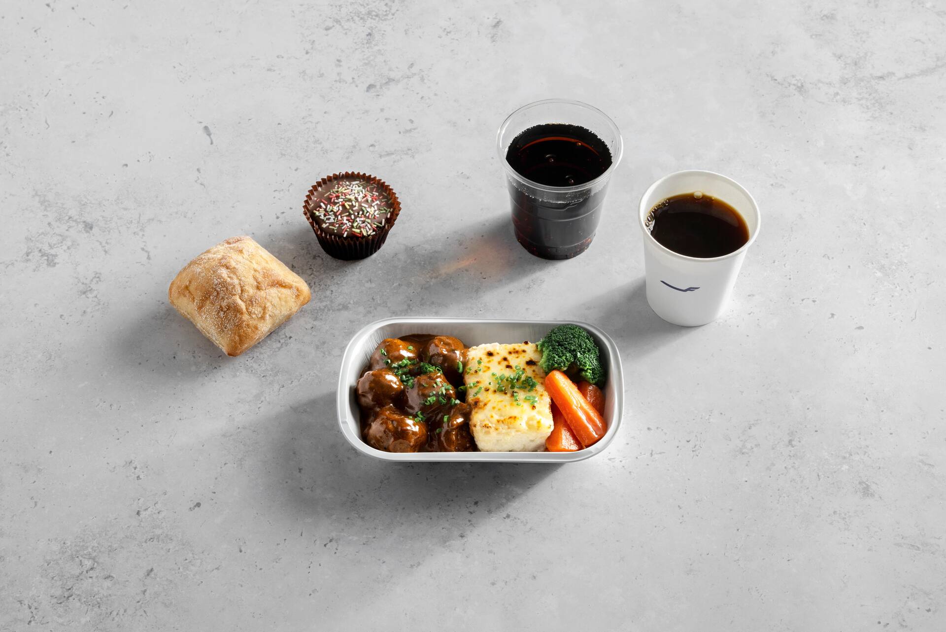 Beef meatballs with creamy pepper sauce, potato gratin and vegetables. The meal comes with a bread roll, butter, a dessert, a cup of coffee or tea and a drink of your choice from red wine, white wine, beer, long drink or soft drink. Please note that drink availability may vary. The meal is gluten-free except for bread and dessert.