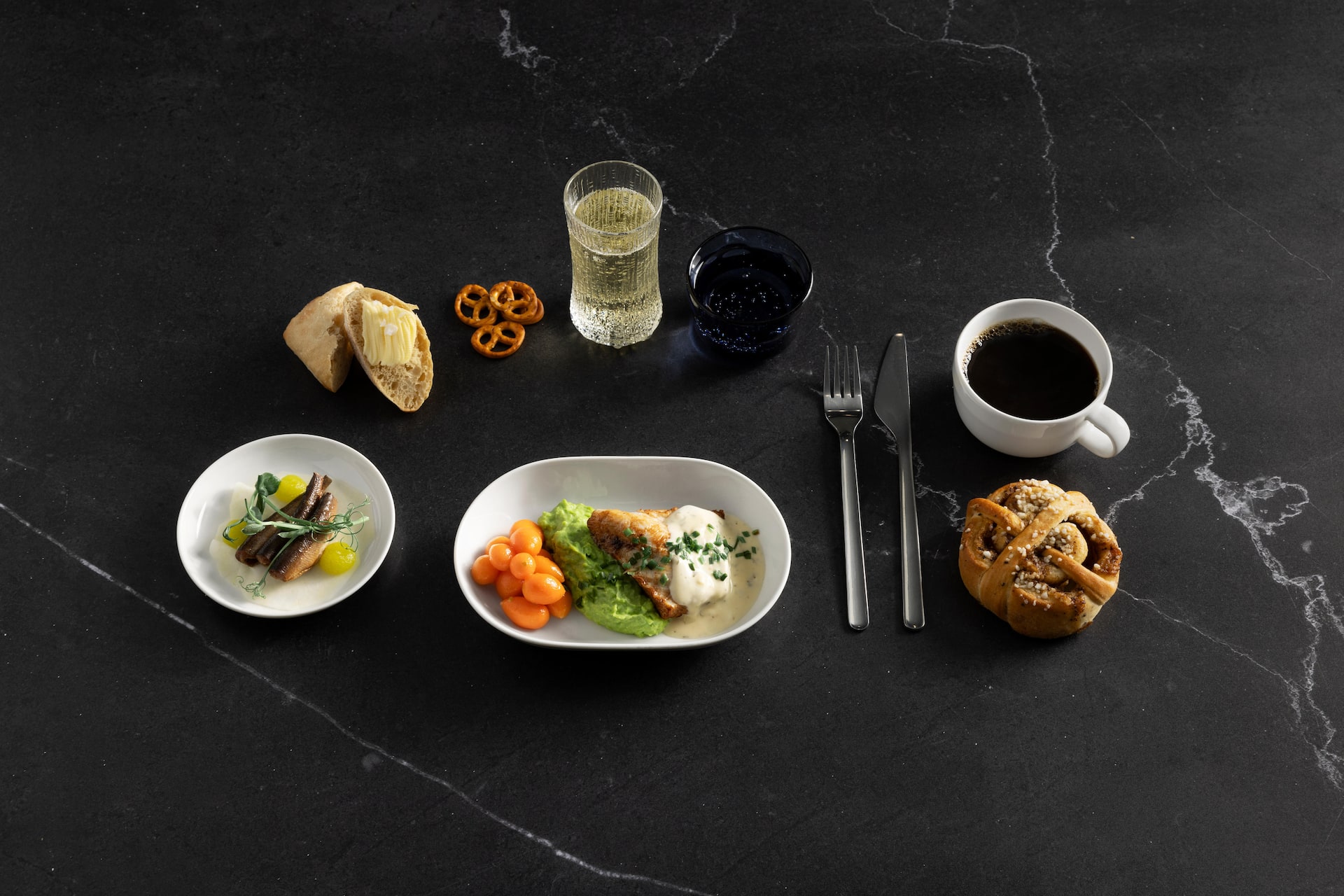 We serve our Business Class customers on short-haul flights a tasty meal. On flights to/from Bergen, Stockholm Arlanda and Vilnius, we offer you a sandwich with a selection of beverages. On all other European flights, we serve a hot main meal, something sweet and beverages.