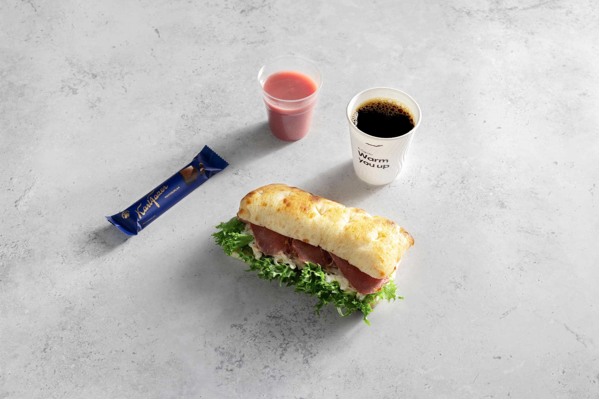 Хлеб [пшеничная мука, вода, цельнозерновая пшеничная мука, соль, дрожжи, оливковое масло первого отжима, солодовая мука (пшеница), может содержать сою и молоко], говяжья ветчина 25% [говядина 95% (ЕС/Германия), вода, соль, стабилизаторы E451, E450, декстроза, антиоксидант E316, консервант E250], майонез без лактозы (рапсовое масло, вода, сахар, сушеный яичный желток, соль, регуляторы кислотности E260, E330, консервант E202, стабилизаторы E415, E412, горчичный ароматизатор, антиоксидант E385), капуста, соус из майонеза [рапсовое масло, сахарный сироп, вода, уксус, яичный желток, горчица (горчичное семя, экстракт куркумы), рисовый крахмал, соль, сахар, консерванты E202, E211, загуститель E415], салат фриллис, вода, салат изогурцов (огурец 66%, вода, сахар, паприка, лук, соль, регулятор кислотности E260, горчичное семя, загустители E410, E412, E406, вкусовые добавки, консервант E202, антиоксидант E300), маринованные овощи (морковь, огурец, сахар, вода, цветная капуста, спиртовой уксус, лук, соль, консервант E202, экстракт белого перца, гвоздика), лук-порей, морковь, модифицированный крахмал, сахар, стабилизатор E415, консервант E211, антиоксидант E300.
